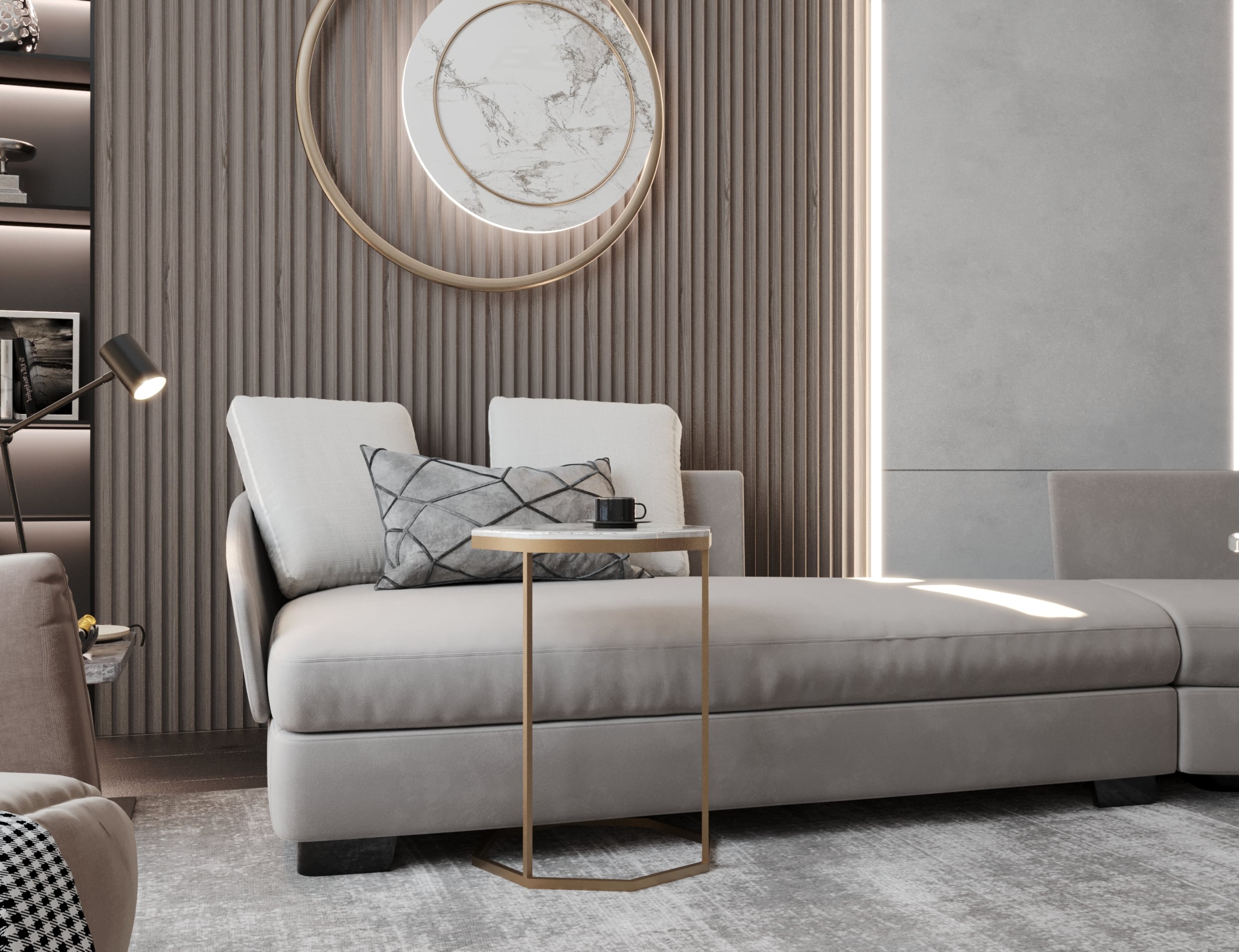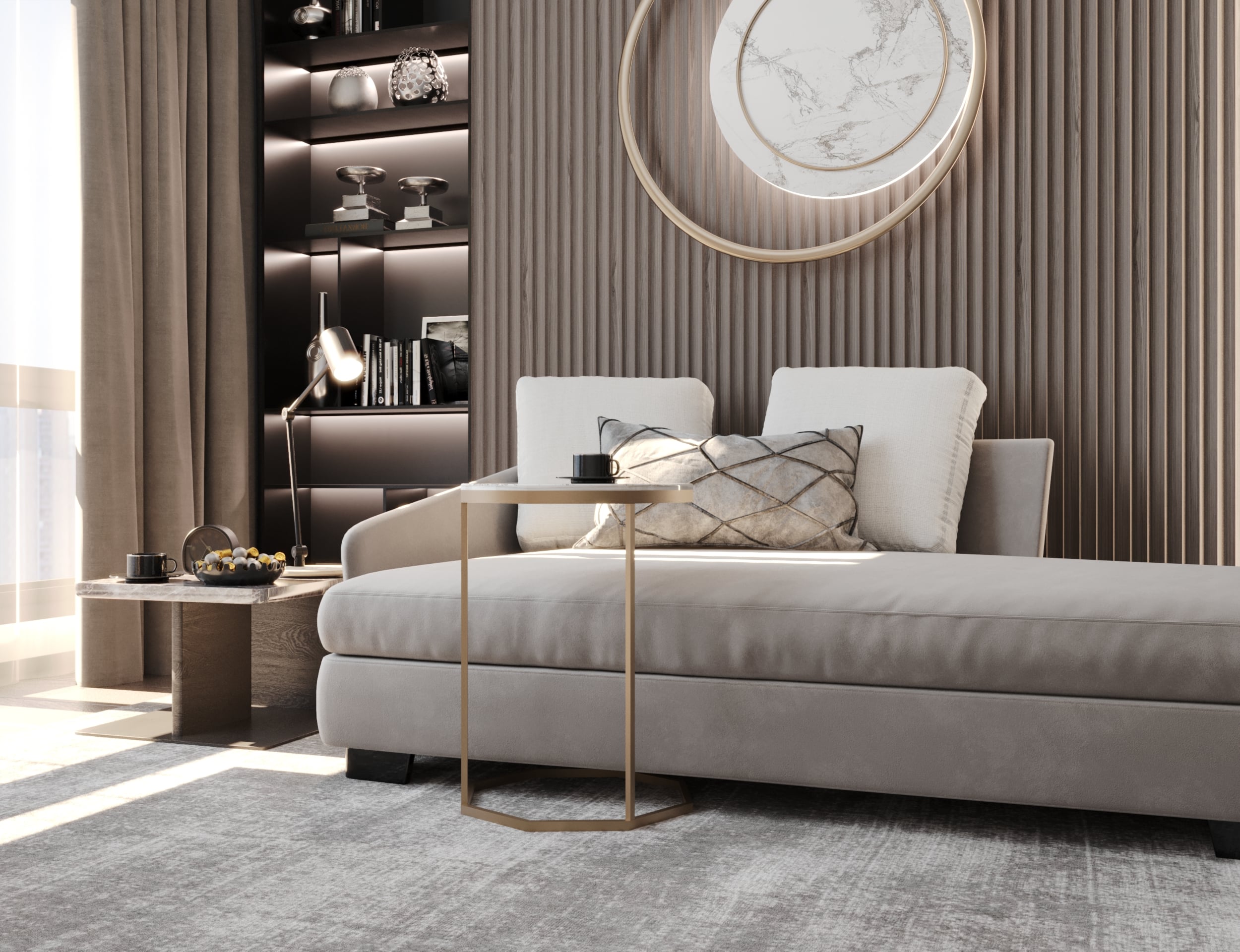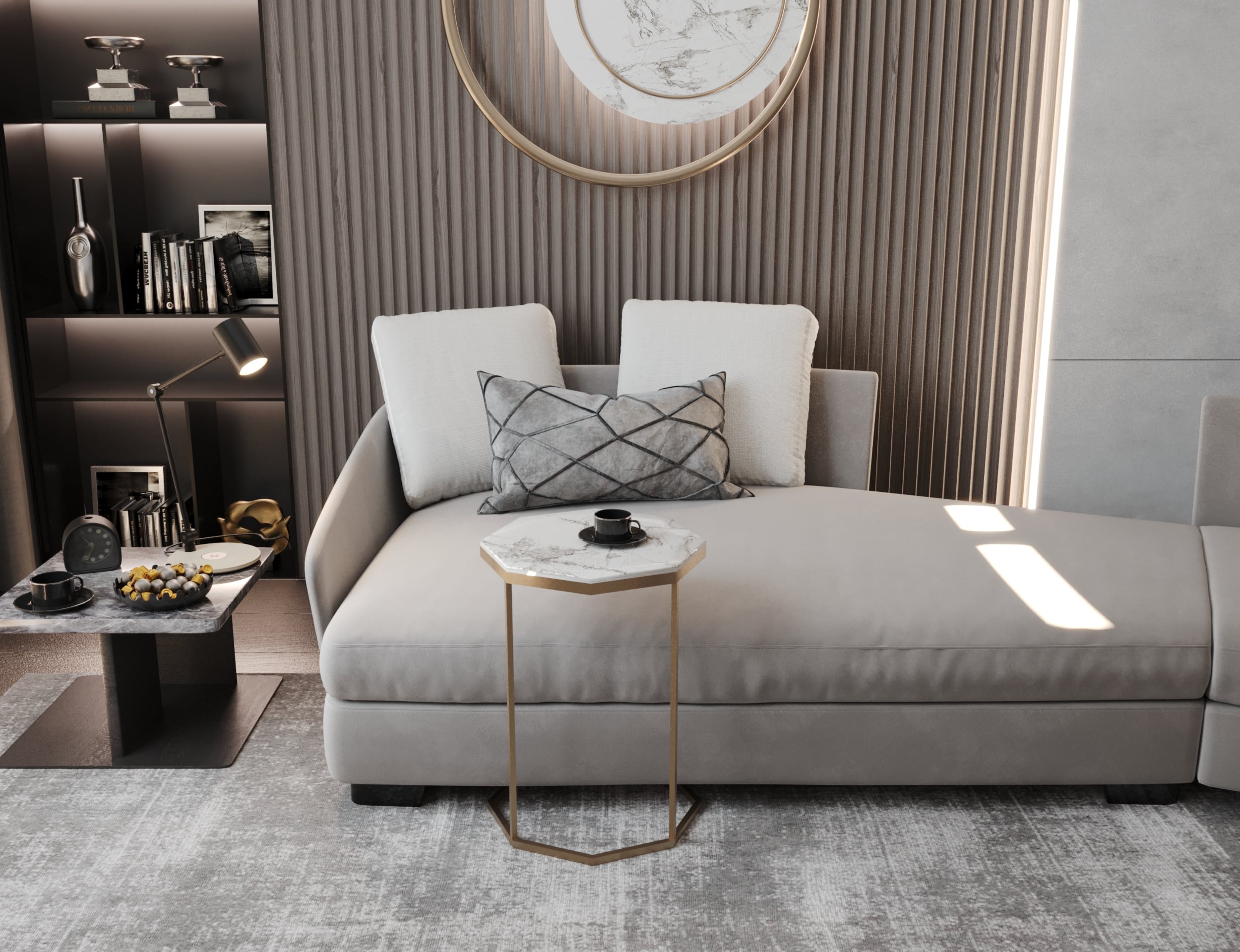 ڨيو سايد ترابيزة جانبية تتميز بمظهرها الأنيق وعملية الاستخدام، تأتي الترابيزة بسطح ثماني الشكل مصنوع من الرخام أبيض اللون بنقوش ذهبية ويتصل به هيكل ذهبي مطفي، يعطي لمسة جذابة للمكان الذي توضع فيه.