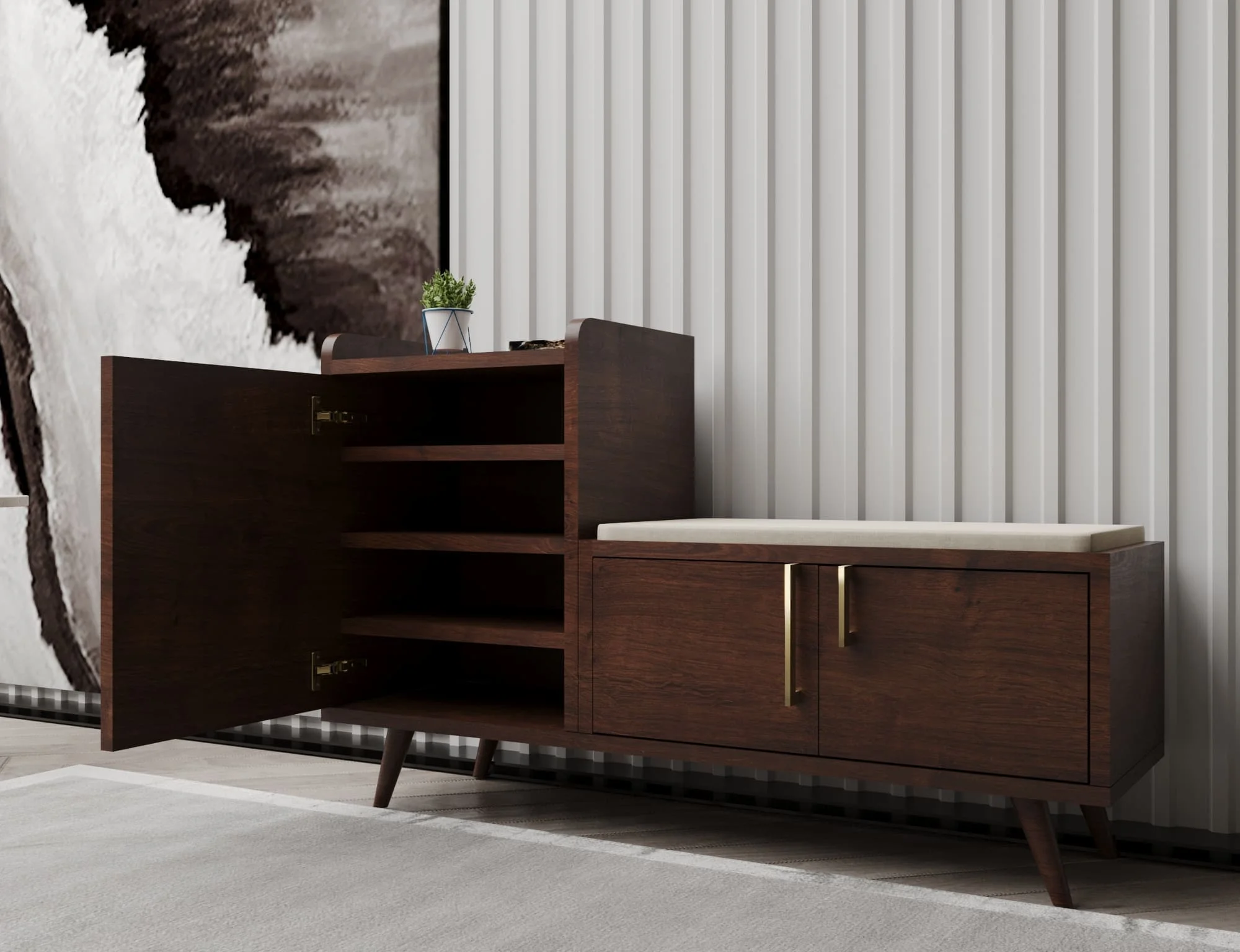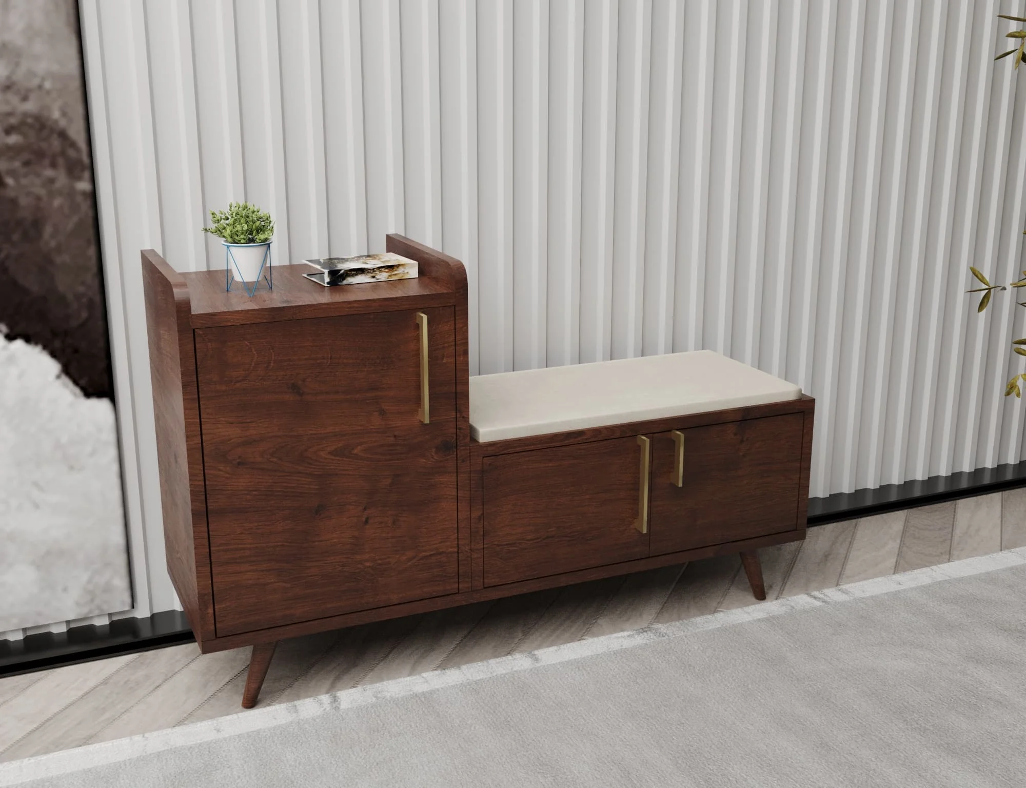 جزامة ستاند جزامة خشب مودرن بمقعد مدمج يمنحها مزيد من العملية، الجزامة مصنوعة من خشب ام دي اف عالي المتانة، تأتي باللونين البيج والبني ما يجعلها متناسبة مع جميع أنواع الديكور، كما إنها تتميز بسعة تخزينها الواسعة حيث تتكون من 3 ضلف و4 أرفف لتخزين الأحذية.