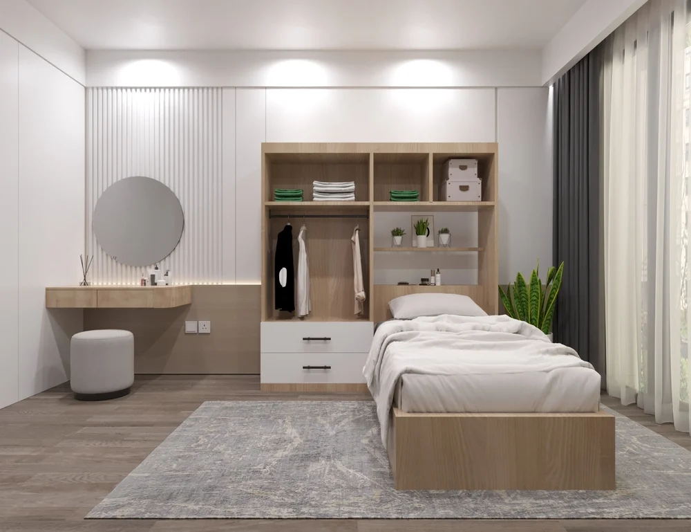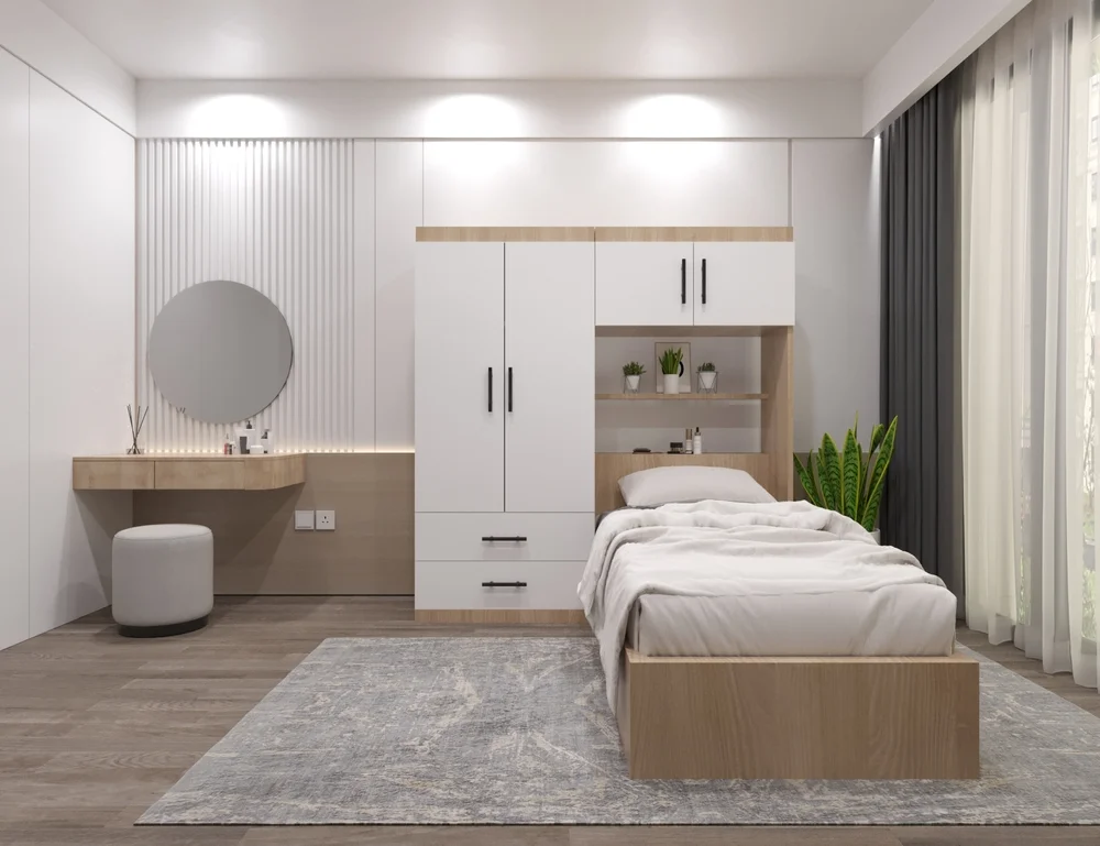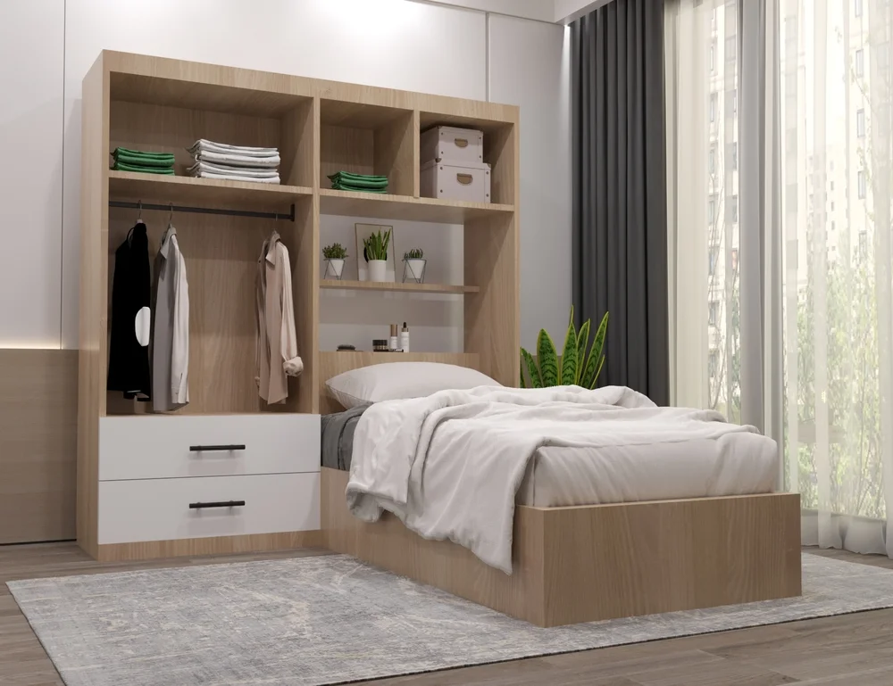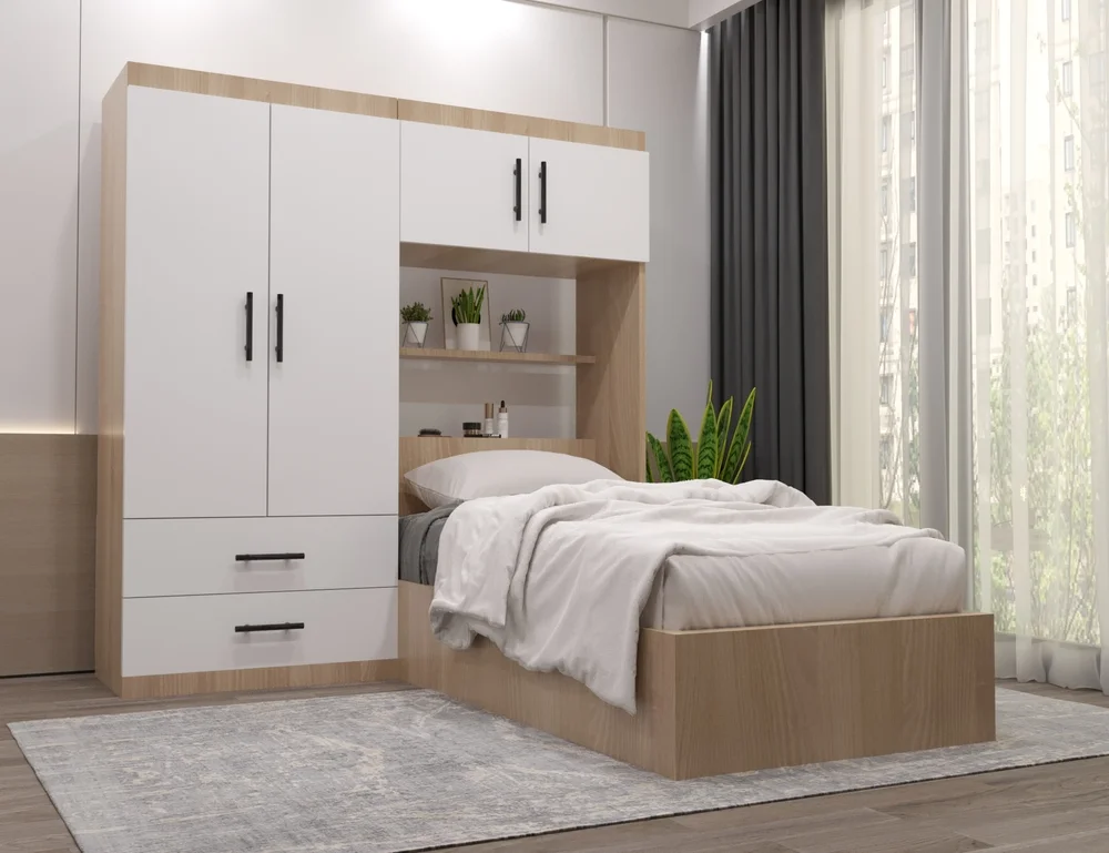- تصميم عملي يوفر مساحة إضافية عبر خزانة علوية فوق السرير