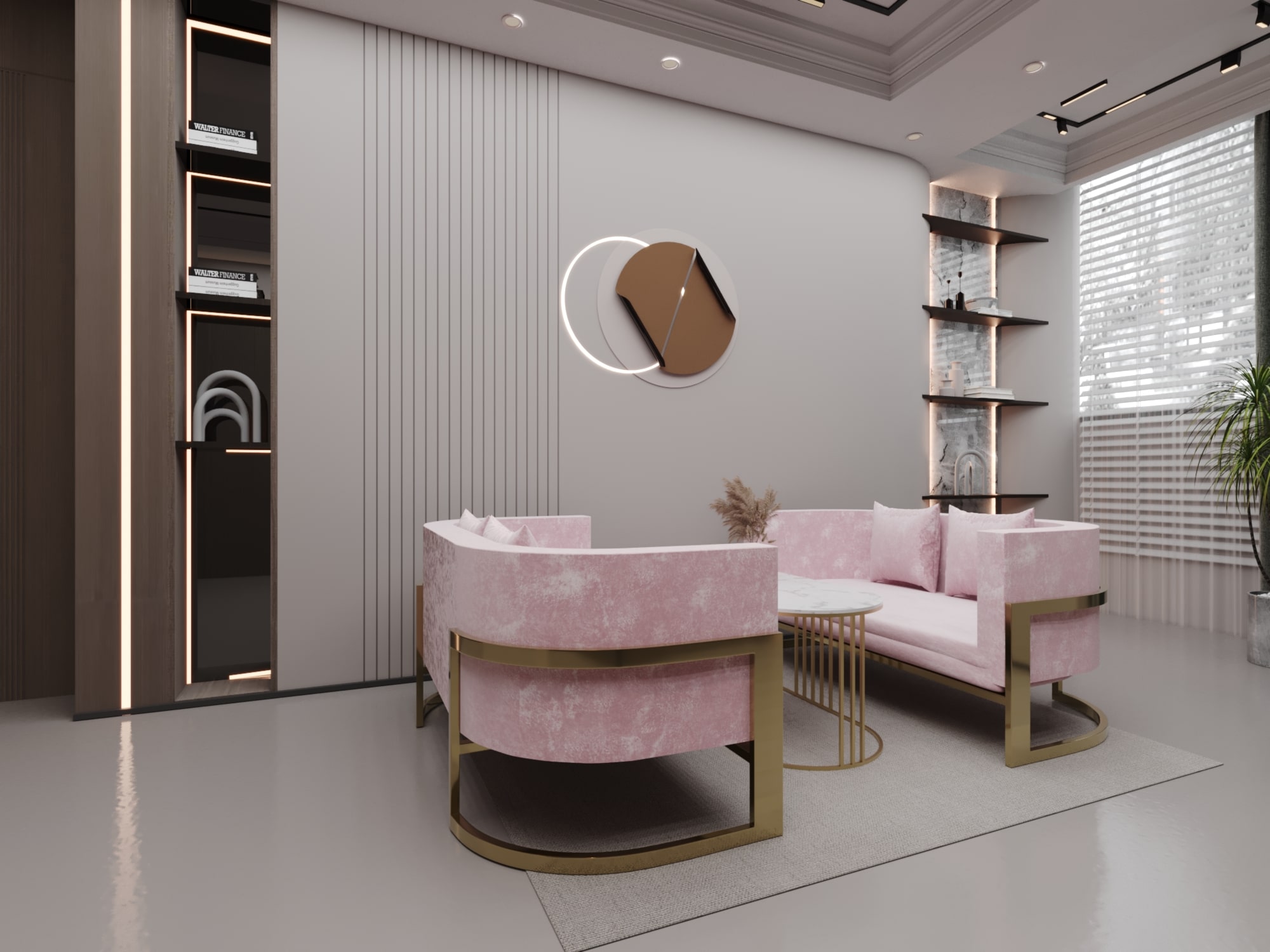 - الخامات: هيكل من الاستيل، سطح الطاولة من رخام كوارتز، وتنجيد الكنب من قماش قطيفة.