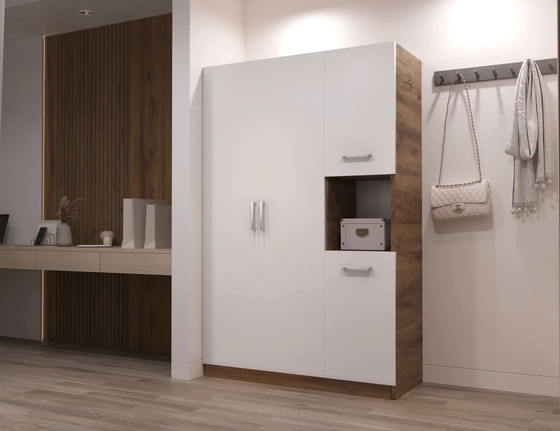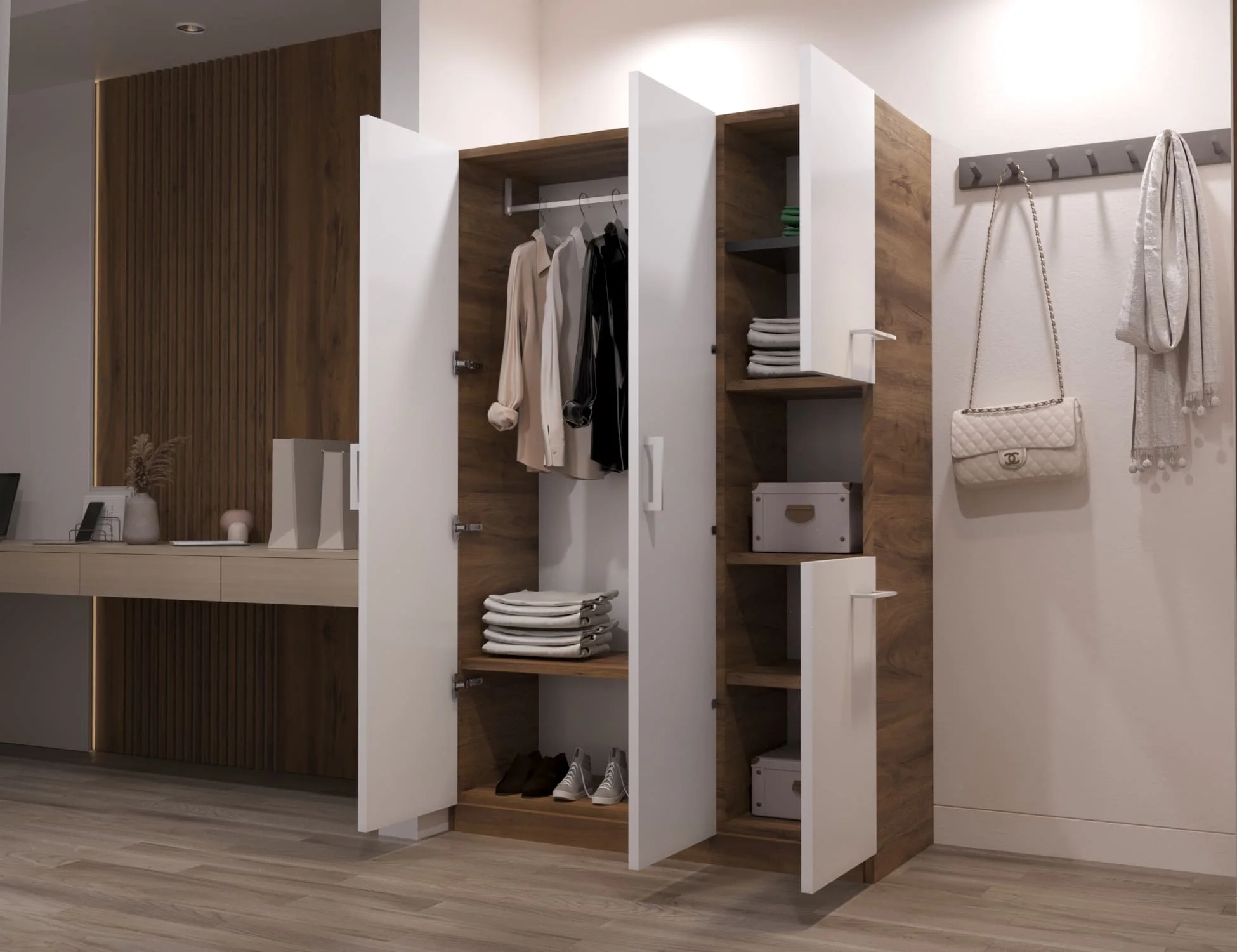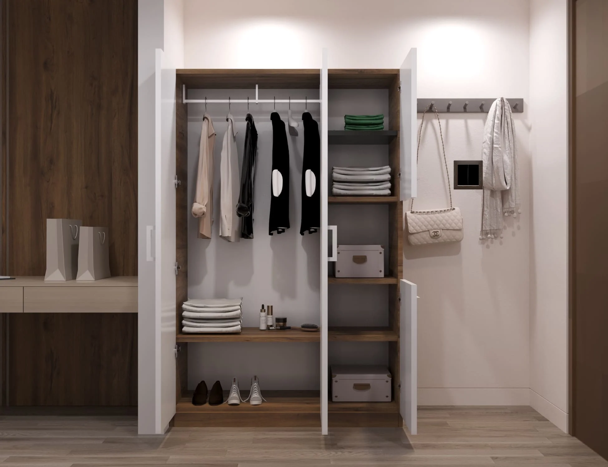 - الضلفتين الكبيرتين تحتويا على شماعة و 2 رف لتخزين الملابس والحقائب وأيضًا الأحذية.