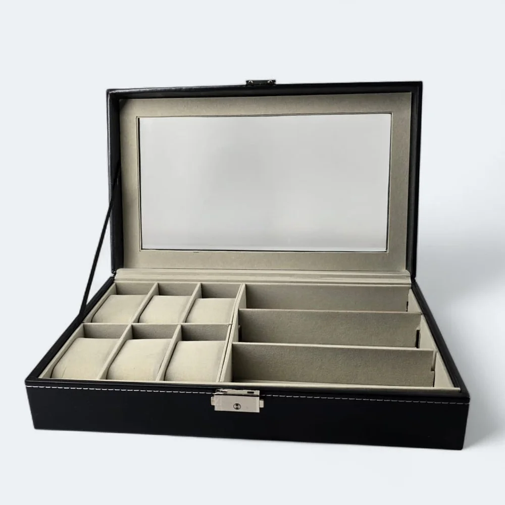 - تصميم كلاسيكي بسيط مكون من 3 شبكات لعرض وتنظيم الساعات بدقة، مع لوحة وسطية لمنع الاحتكاك.