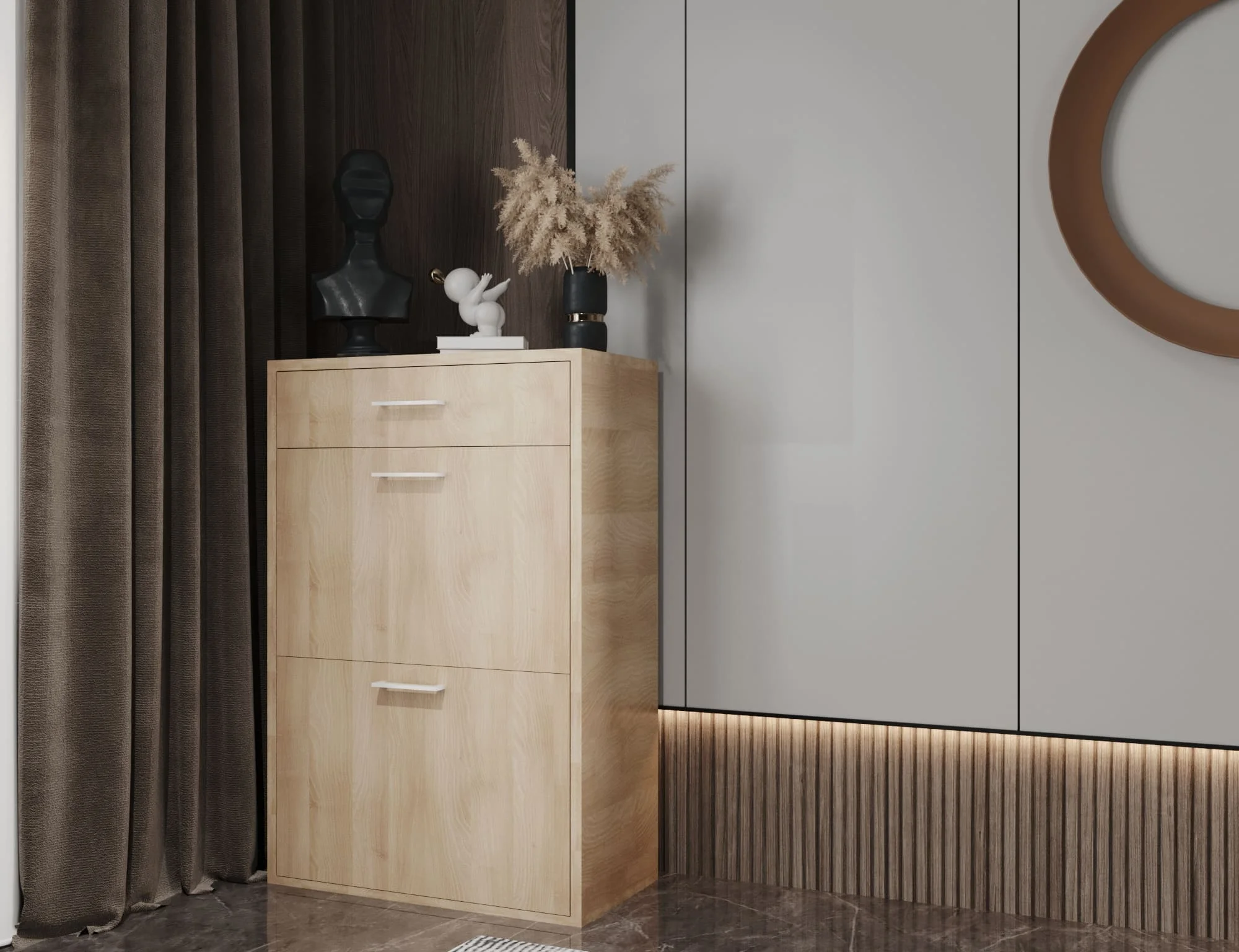 كابينة جزامة خشب مودرن مصنوعة من خشب MDF إسباني 17 ملم عالي الجودة، مميزة بتصميم عصري مصمم للحفاظ على الأحذية من الأتربة.