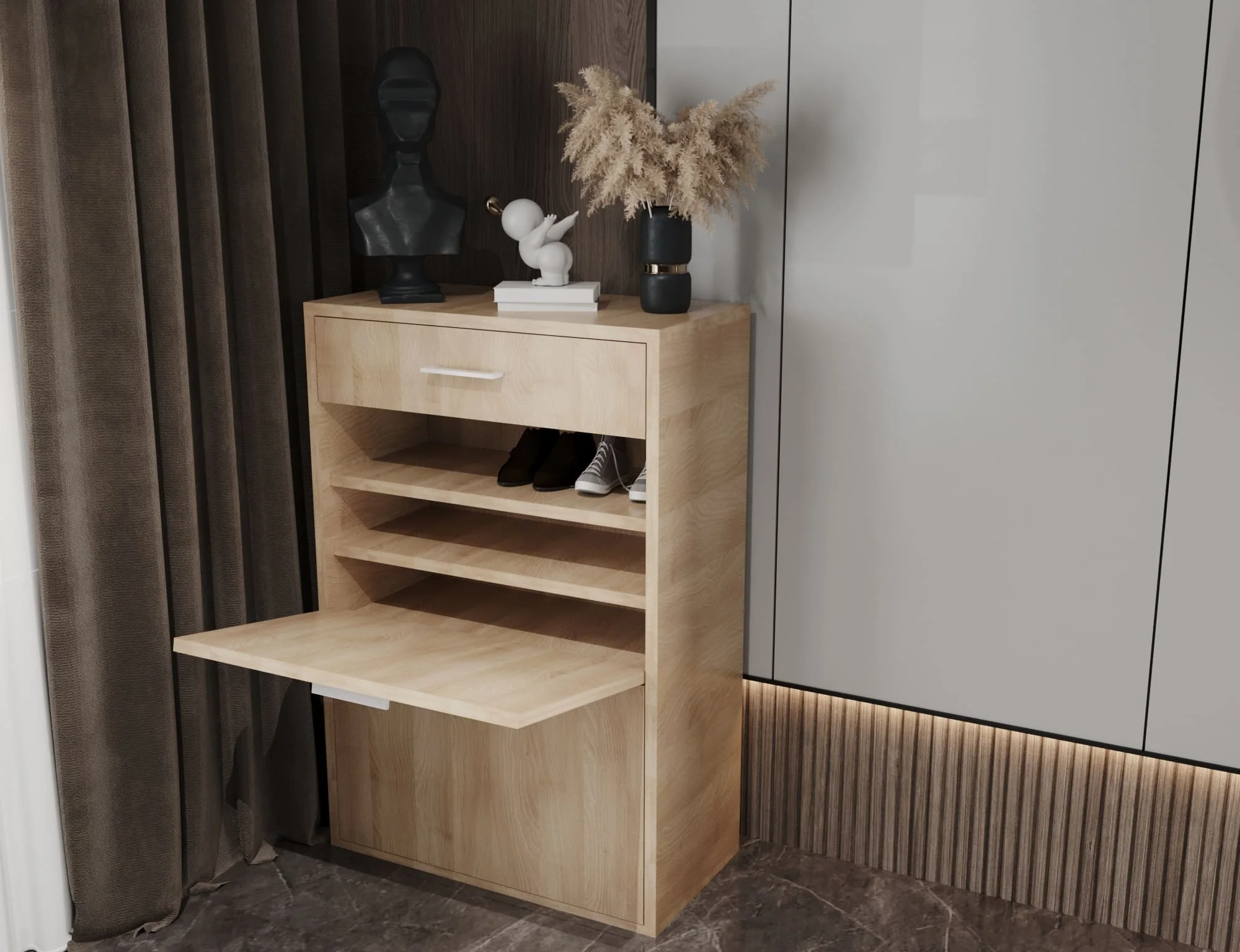 - التفاصيل الداخلية: تحتوي على 2 درج قلاب و 3 أرفف لتخزين الأحذية.