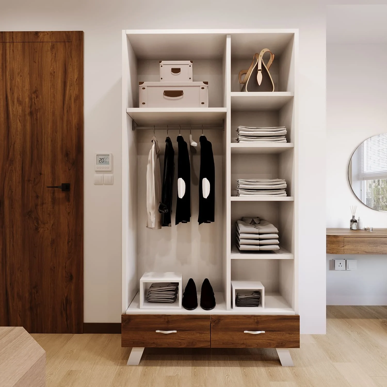 - الضلفة اليمنى مكونة من 5 أرفف لتخزين الملابس والحقائب والأغراض المتنوعة..