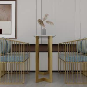 - اللون: الهيكل مطلي باللون الذهبي، والكنبة والكراسي متنجدين بمقاش قطيفة باللون الأزرق الملكي، وسط الترابيزات من الرخام كرارة الأبيض.