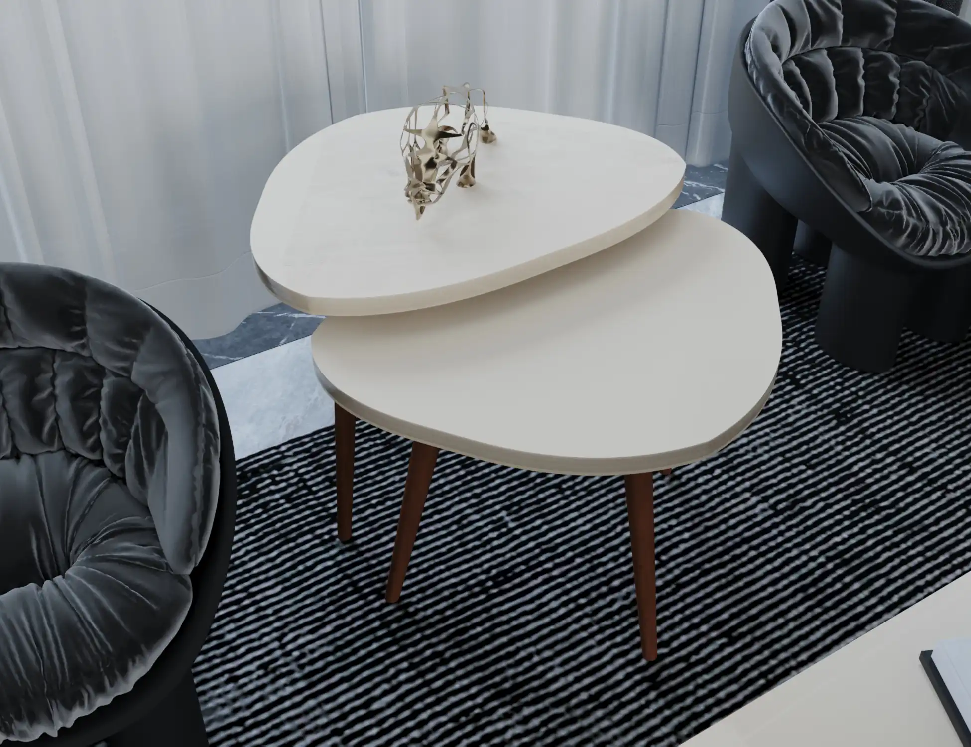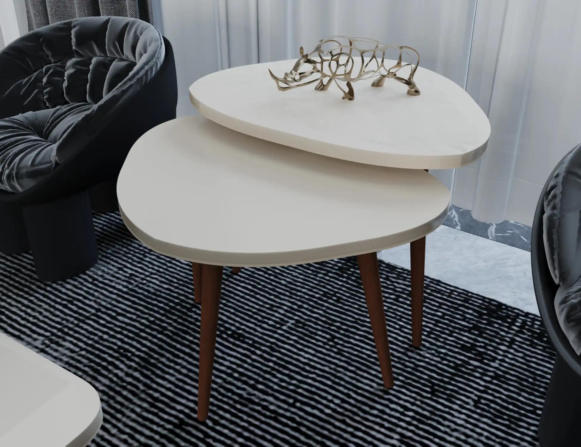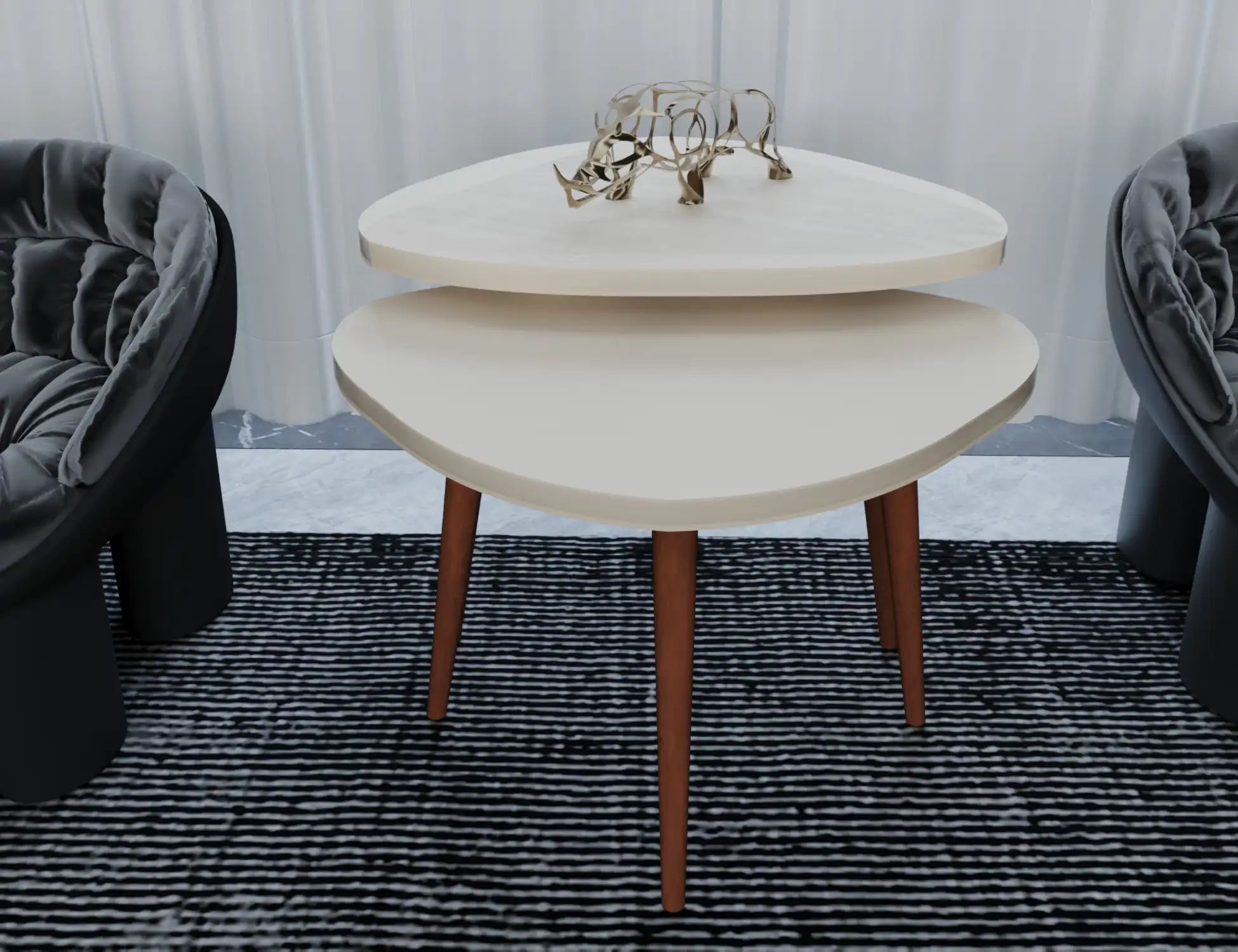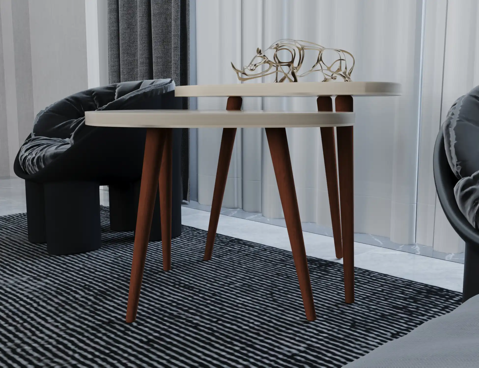 طقم ديو كورنر ترابيزة جانبية مودرن دائرية مكونة من قطعتين بأبعاد متفاوتة ما يجعلها قابلة للتداخل، الترابيزة مصنوعة من خشب mdf عالي المتانة مع طلاء من مادة PVC المقاوم للخدش والرطوبة، مع أرجل مصنوعة من خشب الزان الطبيعي ما يمنحها ثبات أكبر.